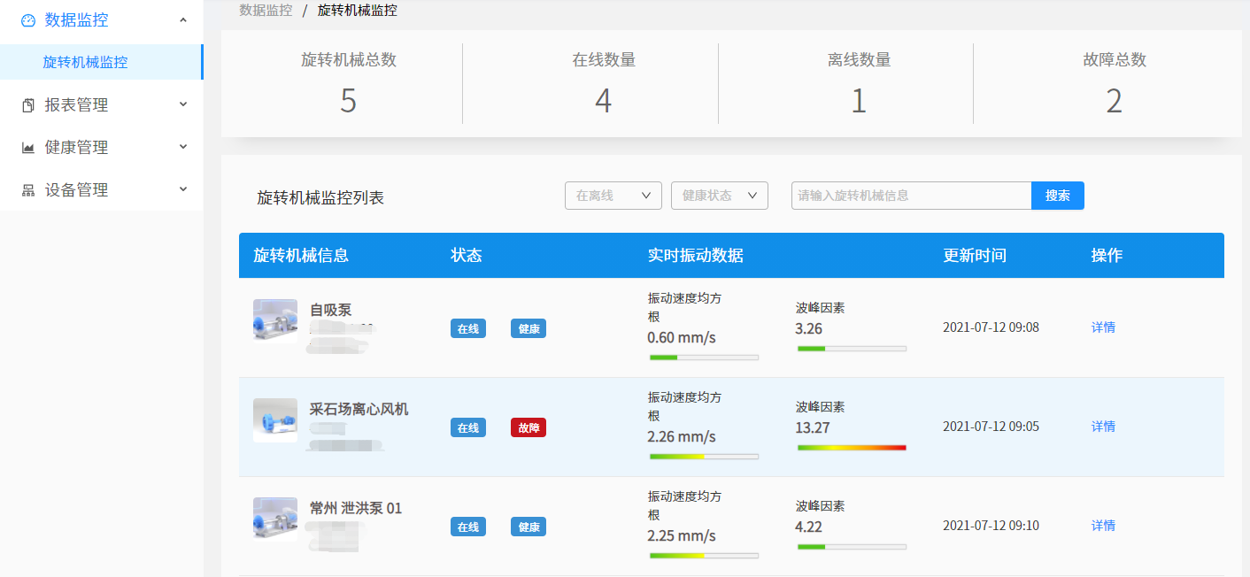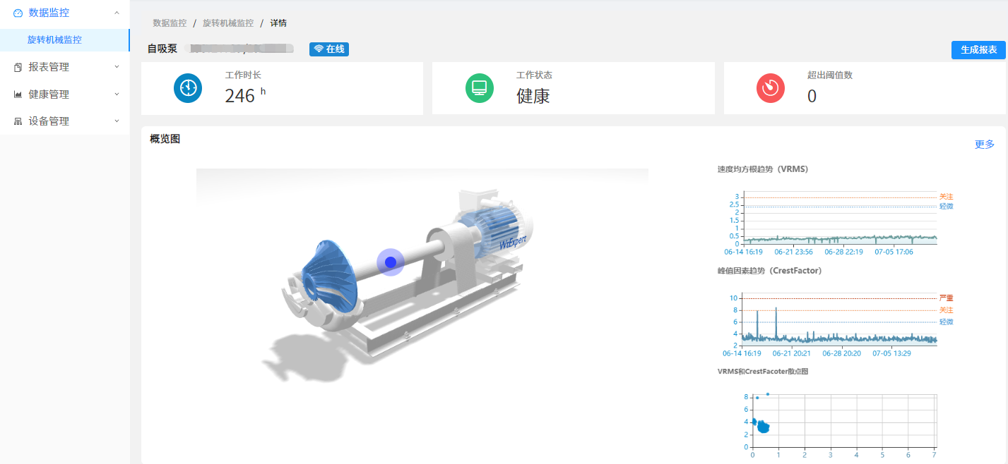 The SaaS service cloud platform for pump fault prediction provides users with platform functions such as status monitoring, fault analysis, scene monitoring, fault management, operation and maintenance management, equipment management, customer management and authority management, as well as platform data reading interface function. Through big data analysis tools, SaaS business cloud platform provides professional users with equipment operation status analysis, early warning fault analysis, and forms professional industrial equipment health diagnosis reports and maintenance suggestions.
