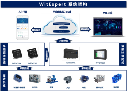 上海輝度/上海輝泰Witium,依托專注于工業(yè)物聯(lián)網(wǎng)+人工智能(工業(yè)AIoT)領(lǐng)域,十年深耕技術(shù)、服務(wù)全球客戶的沉淀,成功研發(fā)出基于機(jī)理及大數(shù)據(jù)數(shù)理模型的設(shè)備預(yù)測性維護(hù)解決方案 -- WitExpert。WitExpert的系統(tǒng)架構(gòu)大致如下。常見的旋轉(zhuǎn)機(jī)械包括電機(jī)、減速機(jī)、空壓機(jī)、水泵、風(fēng)機(jī)等等,通過在靠近設(shè)備振動源的位置安裝溫振傳感器的方式,采集設(shè)備的振動與溫度數(shù)據(jù),將特征值數(shù)據(jù)傳輸?shù)轿覀兊倪吘売?jì)算網(wǎng)關(guān),再通過網(wǎng)關(guān)把數(shù)據(jù)上傳至我們的WitCloud平臺,用戶就可以通過Web端與App端看到設(shè)備的故障預(yù)測及相關(guān)健康信息。