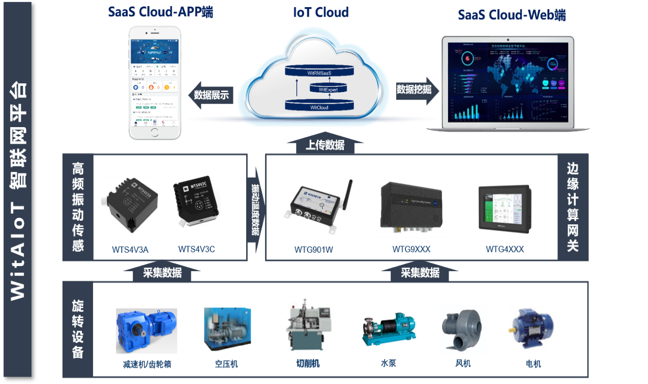 旋轉(zhuǎn)設(shè)備故障預(yù)測系統(tǒng)利用物聯(lián)網(wǎng)高頻振動傳感器,采集設(shè)備振動波形樣本及表面溫度,生成旋轉(zhuǎn)設(shè)備的振動特性樣本;WTG9XXX工業(yè)邊緣計算網(wǎng)關(guān)通過鉑電阻采集電機三相繞組溫度和潤滑油溫度,了解電機運行負(fù)載狀態(tài)并結(jié)合傳感器的振動特性,利用智能機理模型算法對采樣數(shù)據(jù)進行大數(shù)據(jù)分析,實現(xiàn)不平衡、不對中、松動、齒輪磨損、軸承老化等旋轉(zhuǎn)設(shè)備故障的預(yù)測;然后通過MQTT把數(shù)據(jù)樣本及分析學(xué)習(xí)結(jié)果上傳到WitCloud物聯(lián)網(wǎng)數(shù)據(jù)云平臺;系統(tǒng)的SaaS業(yè)務(wù)云平臺為用戶提供狀態(tài)監(jiān)控、場景監(jiān)控、故障管理、運維管理、設(shè)備管理、客戶管理、權(quán)限管理等功能;并提供數(shù)據(jù)接口功能,方便用戶把設(shè)備狀態(tài)導(dǎo)入到智能工廠運維平臺系統(tǒng)。同時業(yè)務(wù)云平臺通過大數(shù)據(jù)分析工具,為專業(yè)的用戶提供設(shè)備的運行狀態(tài)分析、預(yù)警故障分析,并形成專業(yè)的旋轉(zhuǎn)設(shè)備健康診斷報告和維修建議。